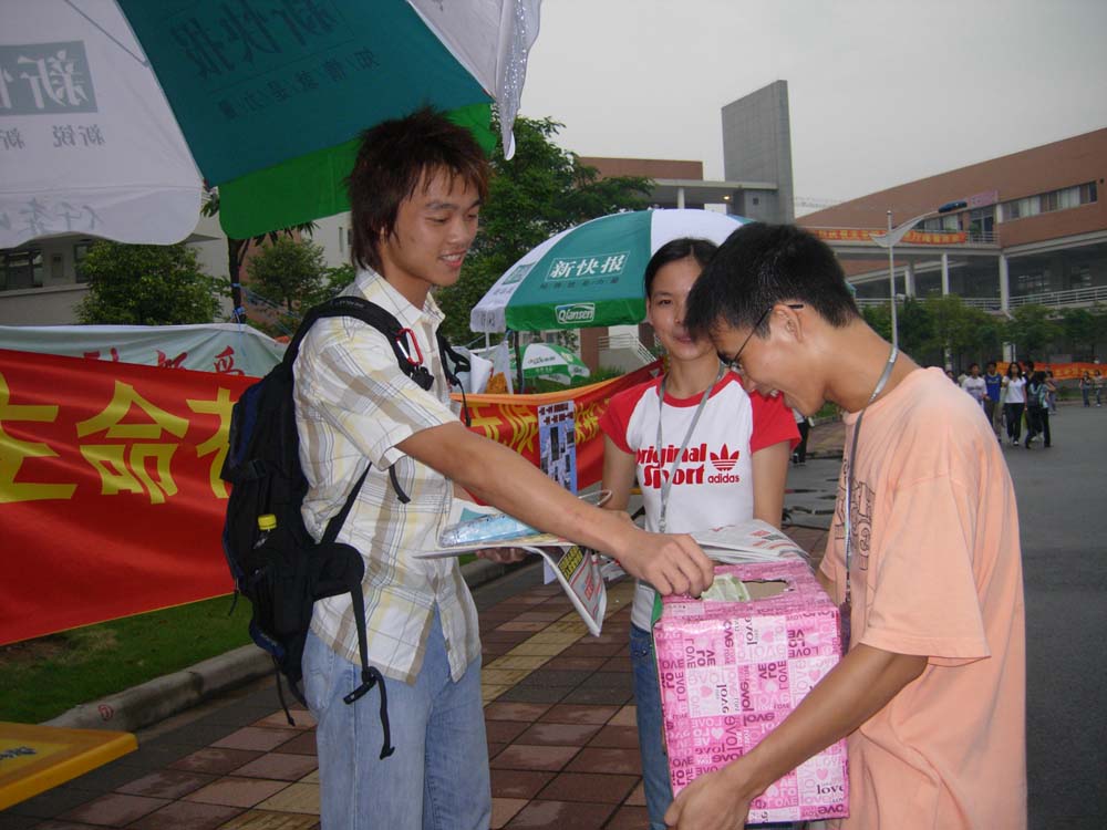 云山书报亭在校道旁边举行了新快报慈善募捐活动。买一份报纸,送一本杂志,卖报所得将全部捐给勤工助学中心三下乡基地小学的学生。卖报的员工表示,远方小朋友的贫困牵动着大家的心,尽管下着雨,他们仍会坚持卖报募款。云山书报亭员工用心良苦和拳拳爱心感动了许多同学,大家踊跃买报。一位同学表示,价格实惠,但最触动人心的是这一举动的意义。