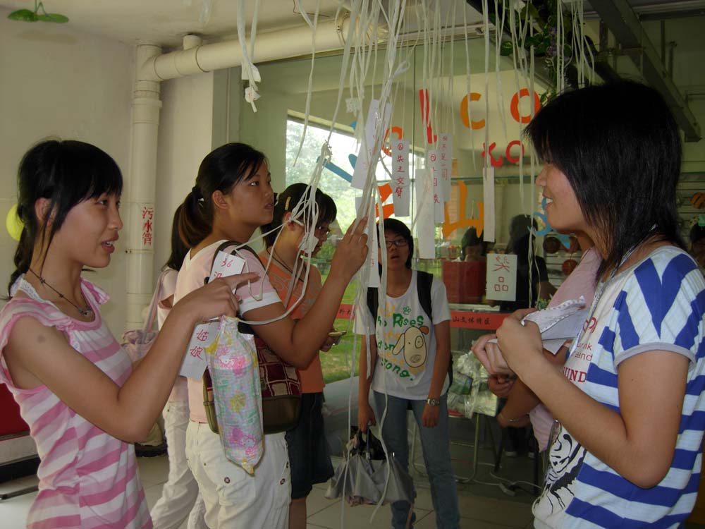 云山文体特区以其本色活动吸引顾客。文化类——猜谜语。谜面是一个词语或成语,打一字,猜对有奖。同学们个个热情高涨,在旁讨论和思考谜底。“啊!我知道了,这个是不是‘捉’字?”。一女生破解了一道谜语,高兴得大叫起来。体育类——刺气球,套圈、投篮,既考体力又考脑力。一系列的促销活动,指定的产品包括笔记本,书本,唱片,笔等文具均以低廉的价格销售,这些活动都吸引了不少同学前来抢购。