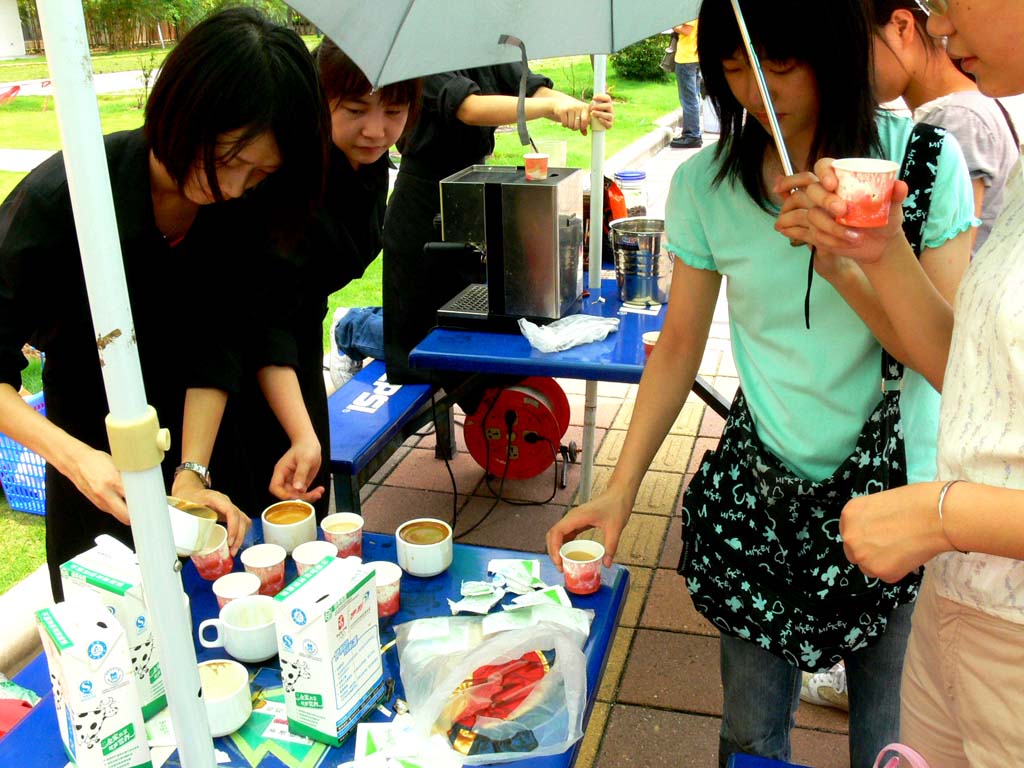 同是第一次参加体验日的实体,云山水榭咖啡屋的体验内容也颇具特色,除了室内的消费优惠,还在校道旁设置摊位现场制作咖啡,同学不但可以免费试饮咖啡,还可以观看咖啡屋员工的抛樽表演。