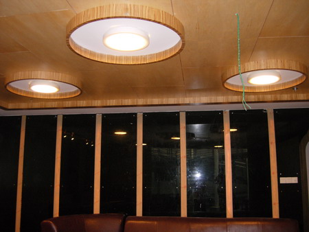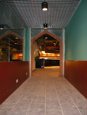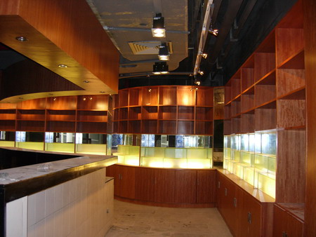 10米宽的吧台设计优雅大方,据负责人表示,将会在木质墙壁上设置钢架,展览名酒佳酿。吧台的一端,有一对玻璃柱子,盘旋而上,极具抽象美感,一片片菱形玻璃在灯光的照耀下晶莹剔透,闪闪发亮。