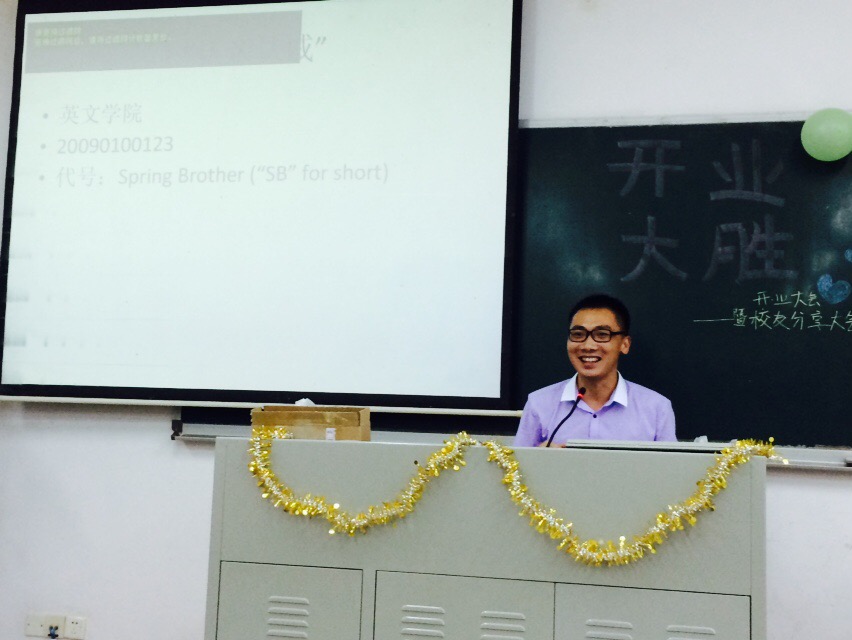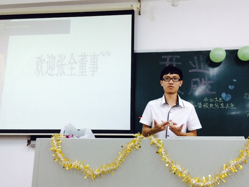 接下来便是学长学姐们的分享时间。第一个上台的是云山书报亭09年的经理李春龙。英文专业出身,毕业后成为一名游戏策划,如今在GeneralElectric(通用电信)工作的他给阁阁们分享了他当初身为经理时的经验,包括他从这个岗位上离开时得到了什么,带走了什么,也和大家探讨了勤工存在的意义,并指出品阁时代才刚刚开始,要由如今的阁阁们为它掌握方向。分享结束后他还通过微信抽签的形式为几位幸运儿送上他亲自准备的礼物,足见其真诚友好。随后的张雨学姐作为曾经云山凉茶坊的办公室主管,一上来就给大家分享了她在台湾旅游的照片和趣闻,并以漫画家几米的几句话作为引子,如“奇迹迷路了,寂寞上场了”、“秘密花园开了”等,为大家讲述了她在这几句话中想到的关于人生、成功甚至感情的共勉。而在场的另一位学姐则是往届的云山凉茶坊副经理陈静雯,她以自己的经历为例,总结了许多“金科玉律”,幽默之余还频出金句:“你永远不会使所有人满意。”“一直完美地完成平凡的工作是一种优秀。”以及“年轻的美好在于我们敢想敢干。”等等,让台下的阁阁们欢乐而又赞叹不已。