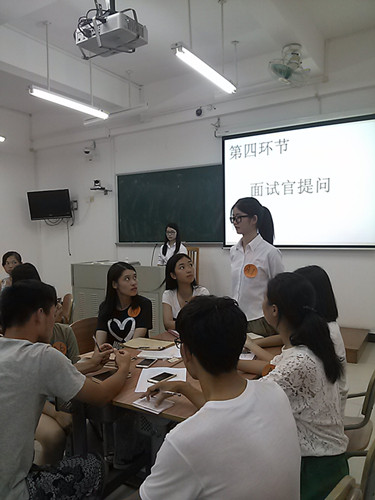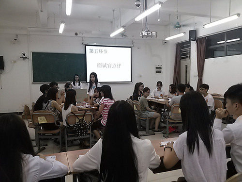 第三环节的无领导小组讨论旨在考验新生们的组织规划能力和合作能力。在给出了题目后,新生们便开始了热火朝天的讨论,面试官们也离开座位来到新生中观察他们的表现。有的新生表现积极,频频发言,引导着小组的讨论进程;有的稍显文静,手头的笔已在笔记本上记下每个人的观点;有的针锋相对,因意见相左而各持己见;有的出言调解,力求得出最佳解决方案。