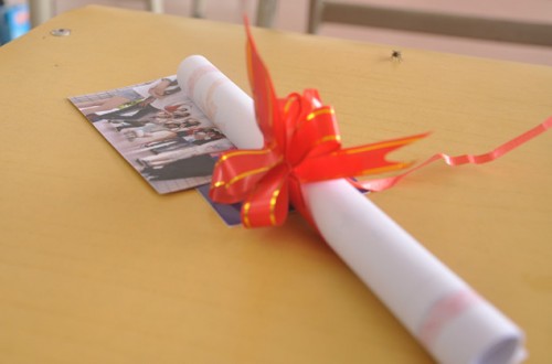 而后义教组的老师们把夏令营的结业证书和合照颁发到每一位学生的手中,合照还写着“老师们期待着你们的成长”。