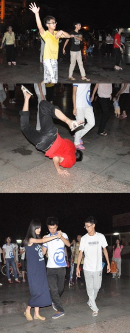 在例会结束后,队长邱雯霞提议大家到文化广场散散步,与广场大妈们“抢地盘”跳起了舞,而后勤组组长王灵植更是开班教大家跳宫廷舞。队员们有的跟着大妈们学习广场舞,有的跟着“舞林霸主”王灵植学习高雅的华尔兹和宫廷舞,有的手忙脚乱地学习骑自行车,更有的坐在台阶上“看星星数月亮”。