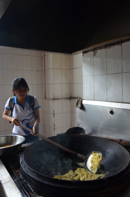 一切洗切准备工作过后,最精彩的重头戏便落在炒菜这个环节上面。看着食堂阿姨轻松地炒出一盘金黄嫩滑的鸡蛋后,在旁观看的周颖早已按捺不住掌勺的热情,接过阿姨的勺子,驾轻就熟地炒起来,迎着锅里的热气,认真观察鸡蛋在锅里煮熟的程度,她小心翼翼地拨弄手中的勺子。“看我炒的鸡蛋,不错吧!”擦过额上汗水,周颖掩盖不住脸上的自豪。