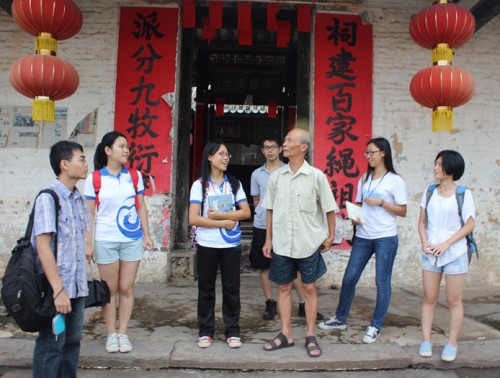 林深泉先带队员们参观了位于兰寨的林氏宗祠,并解说位于大厅上的牌匾。他说道,大约190年前,兰寨出了首位状元林召棠,于是村子的人便修建了这座宗祠以纪念他。现年70多的老校长依然健朗善谈,滔滔不绝的为队员们讲解宗祠的历史。听及队员们想进一步了解连滩非物质文化遗产飘色艺术的状况时,他还热心的向队员们推荐当地的一位资深专家以了解情况。